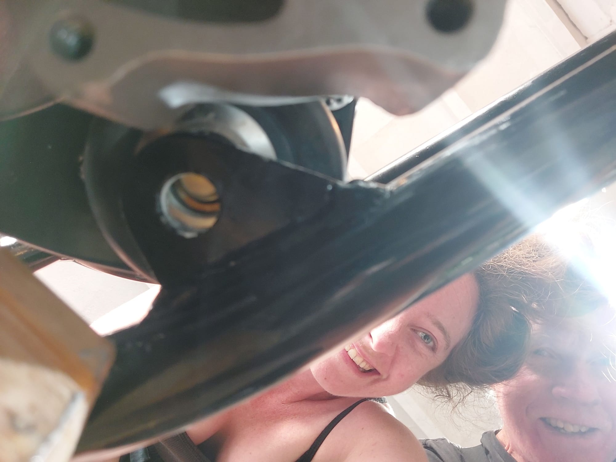 We lay the engine on the floor and put the frame over it. The main problem was lining up the bolt holes for the front engine mount. Had to stand the whole thing upright in order to do that.
