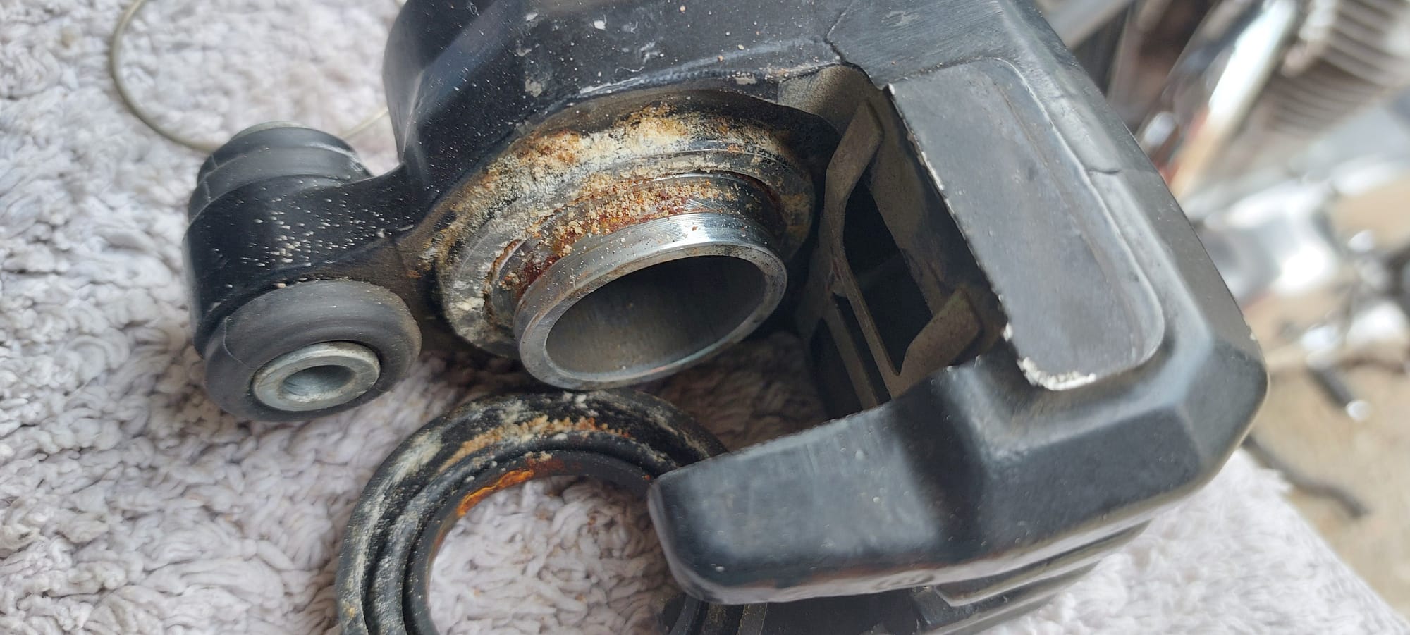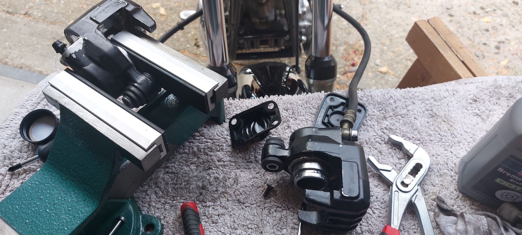 Getting both pistons out was not so obvious as once one comes out using the hydraulic fluid, the other can't be moved. Having a setup where only one brake is connected to the master cylinder at a time would make this easier for the future. I eventually got them out though and cleaned up everything.